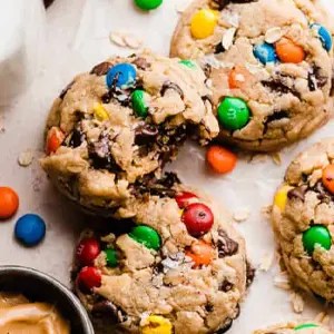 This flourless cookie has a peanut butter and oatmeal based and is bursting with semi-sweet chocolate chips and m&m’s